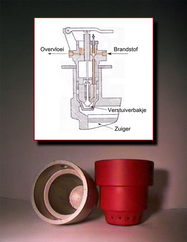 De brandstof druppelt tijdens de aanzuigslag in het verstuiverbakje. Het verstuiverbakje is van een aantal kleine, naar de verbrandingsruimte van de motor gerichte, openingen voorzien.