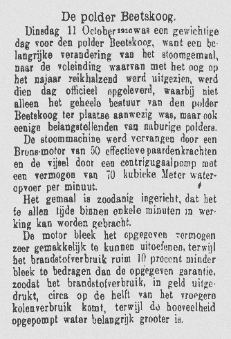 De polder Beetskoog tussen Beets en Oudendijk werd sinds de zeventiende eeuw boven water gehouden door twee windmolens. Maar in 1877 stapte het polderbestuur op een stoomgemaal over.